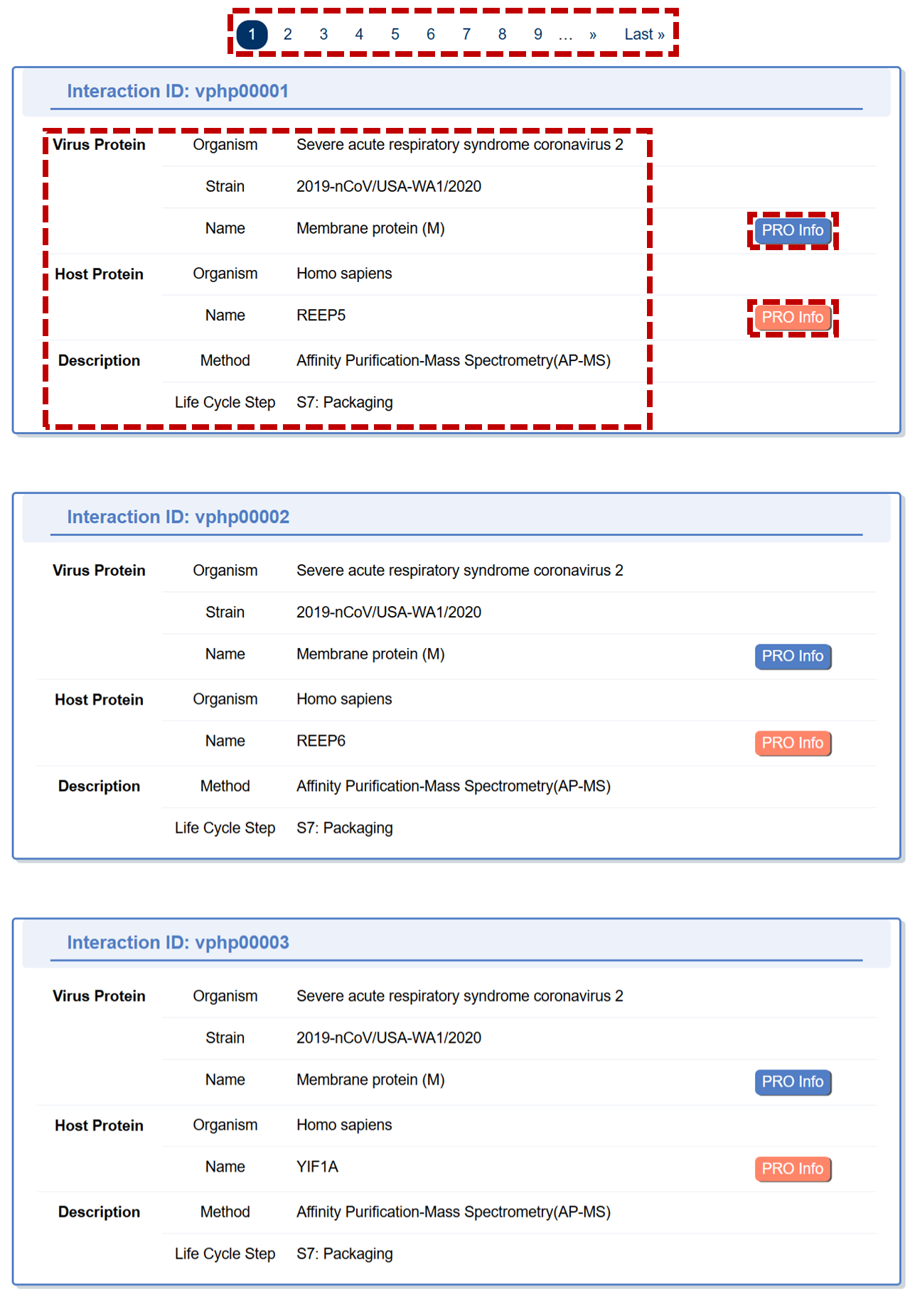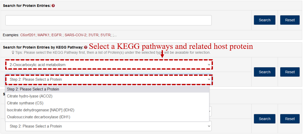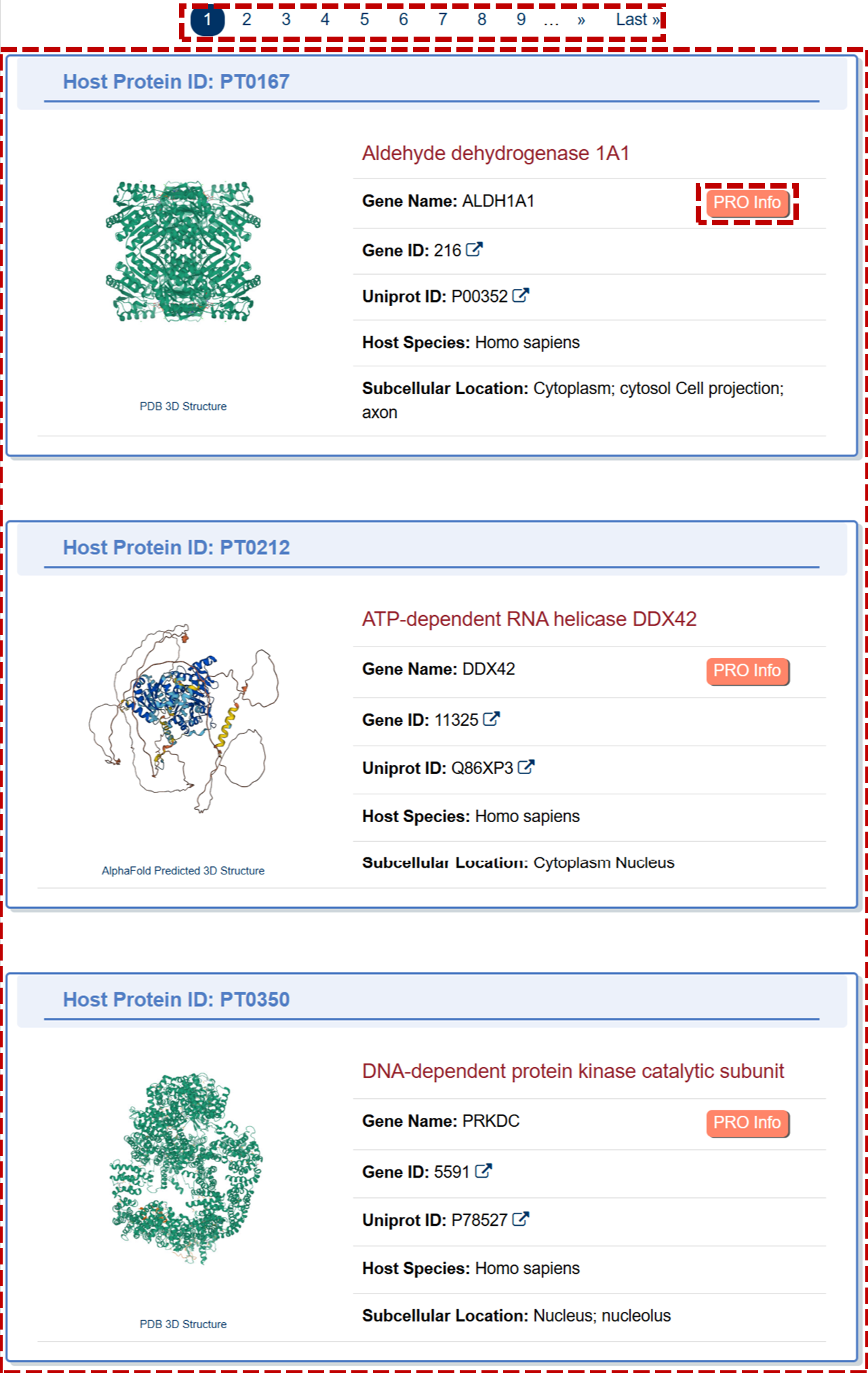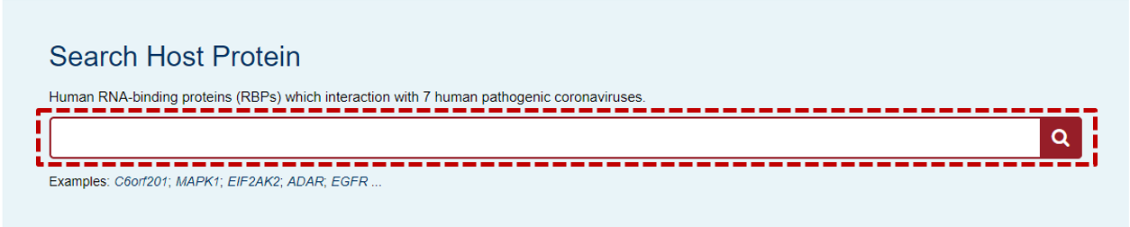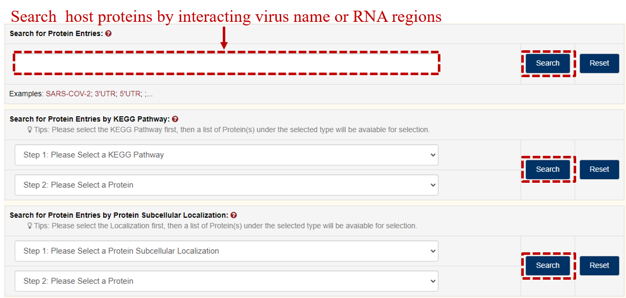 Host protein related interactions can be searched by entering the protein name in the “search box” on the main page and in the “Search for protein entries” on the search page.