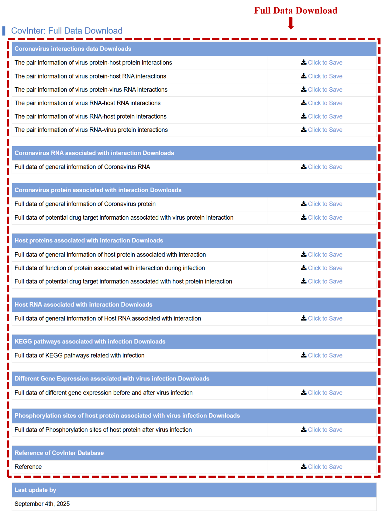 The Download page allows users to download all Full data from the database, including “Coronavirus interactions data Downloads”, “Coronavirus RNA associated with interaction Downloads”, “Coronavirus protein associated with interaction Downloads”, “Host proteins associated with interaction Downloads”,“Host RNA associated with interaction Downloads”, “KEGG pathways associated with infection Downloads”, “Different Gene Expression associated with virus infection Downloads”, “Phosphorylation sites of host protein associated with virus infection Downloads”and “Reference of CovInter Database”.