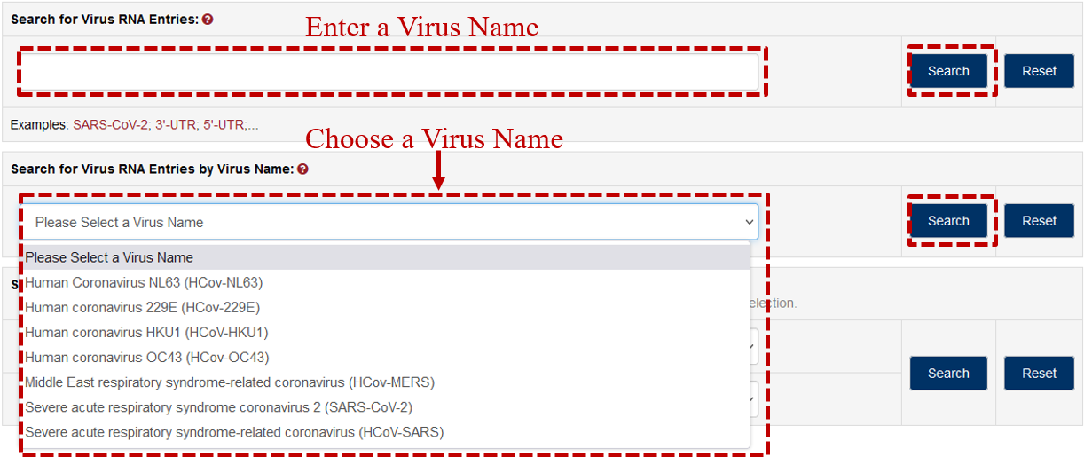 For example, if users want to know detailed information on the interaction with any of the SARS-CoV-2 RNA, Users can search by entering a virus name in “The Search for Virus RNA Entries” box or by selecting a virus name in the “Search for Virus RNA Entries” box.