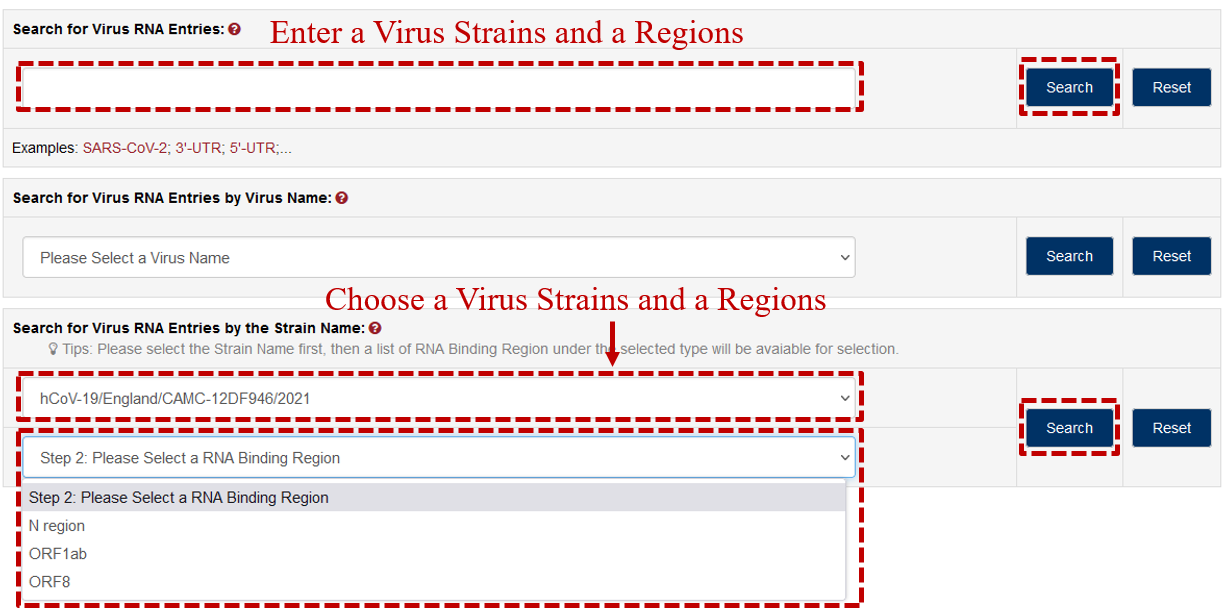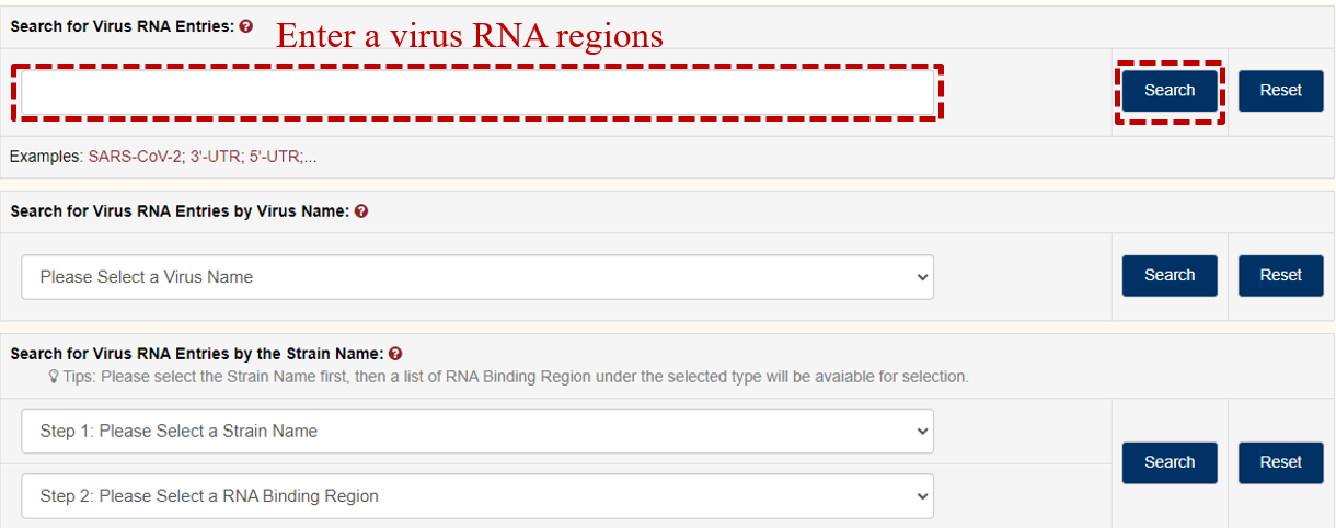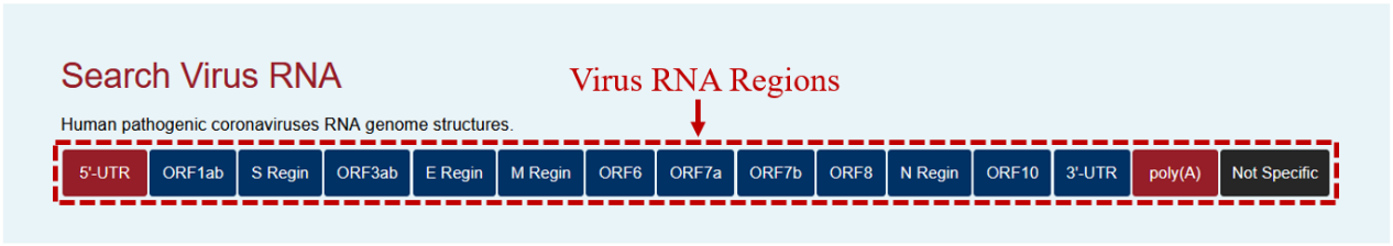 If users want to know detailed information on the interaction with any of the Coronavirus RNA regions, users can search by clicking the different RNA regions on the main page, or Search for Virus RNA Entries: “by Virus Regions name on the Virus search page.”