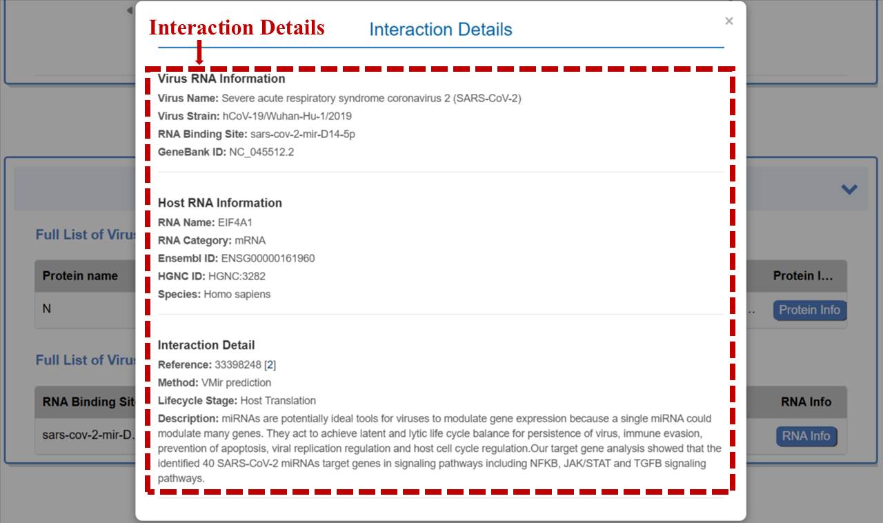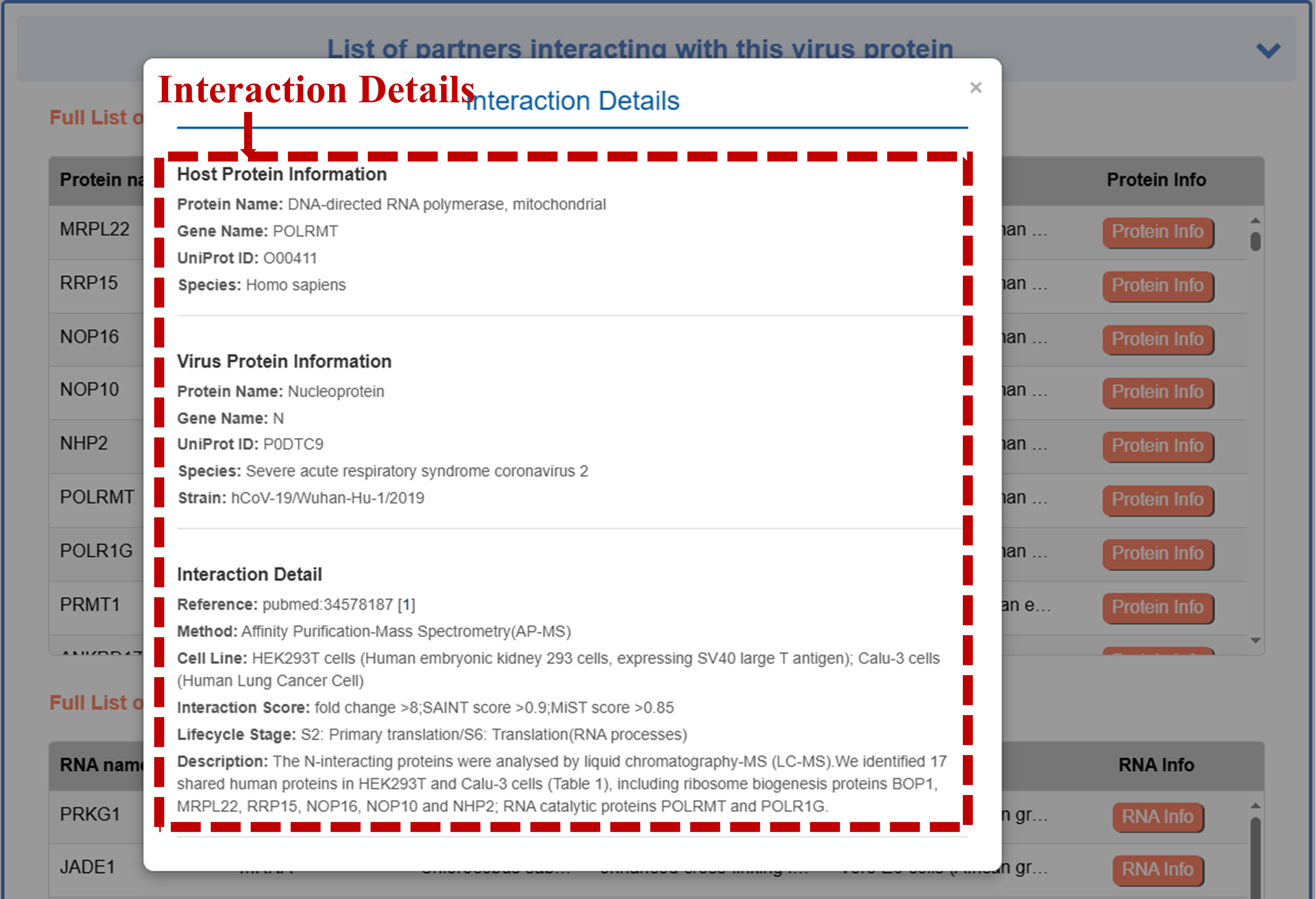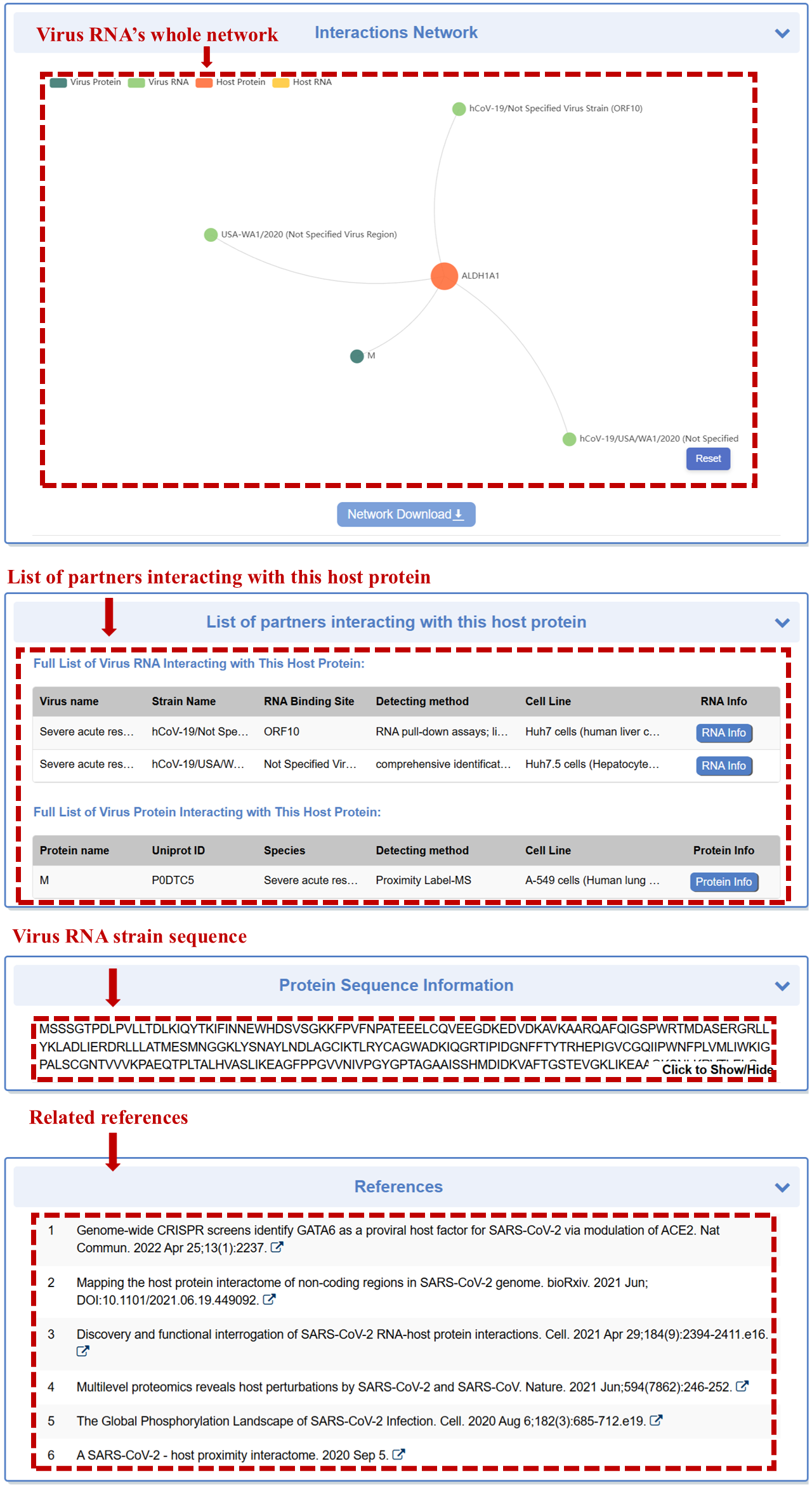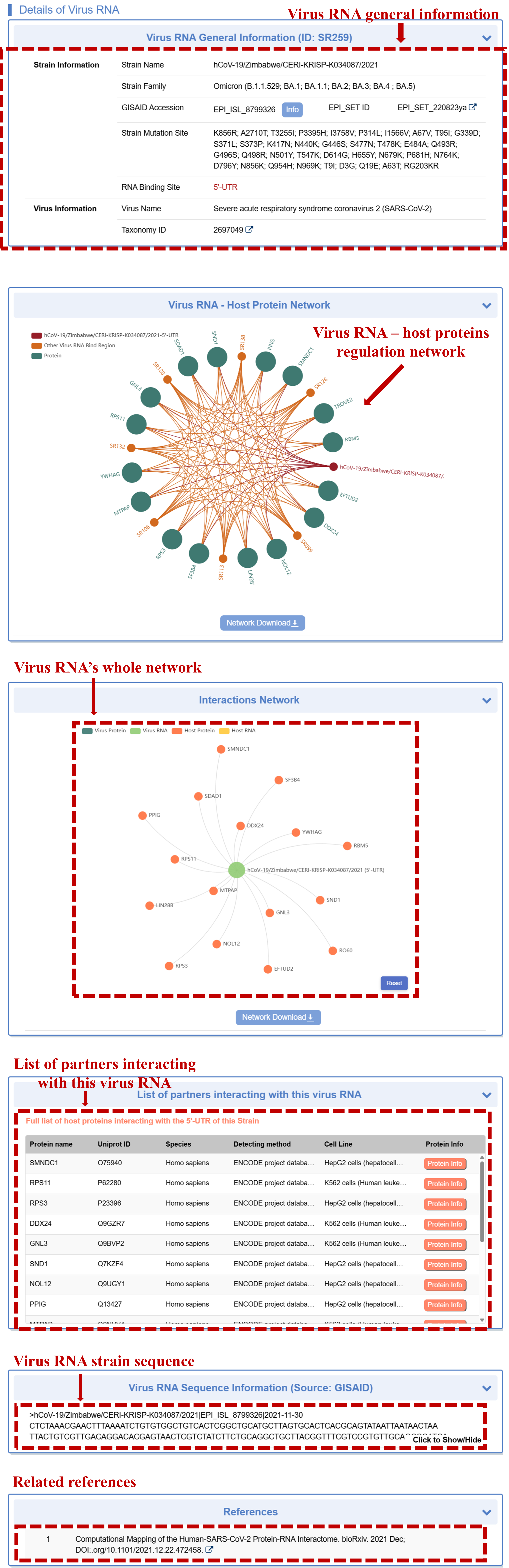 The virus RNA page contains mainly “Virus RNA General information”, “Virus RNA-Protein Network”, “Interactions Network”, “List of partners interacting with this Virus RNA”, “Virus RNA Sequence Information” and “References” information.