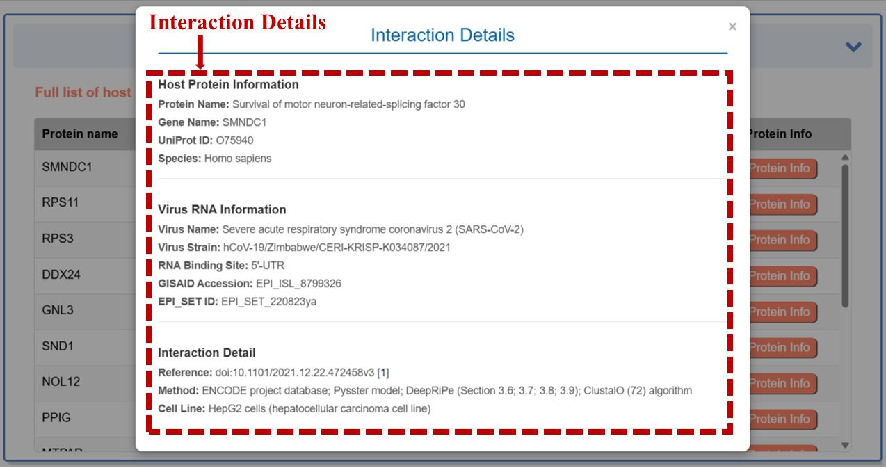 The resulting webpage displays profiles of all the strains regions and strains general information on “SARS-CoV-2”. By clicking the hyperlinks “Detail info” button, detailed information on SARS-CoV-2 strains regions and host protein interaction information can be recursively searched.
