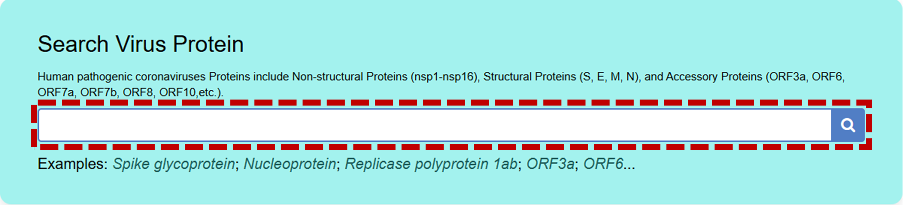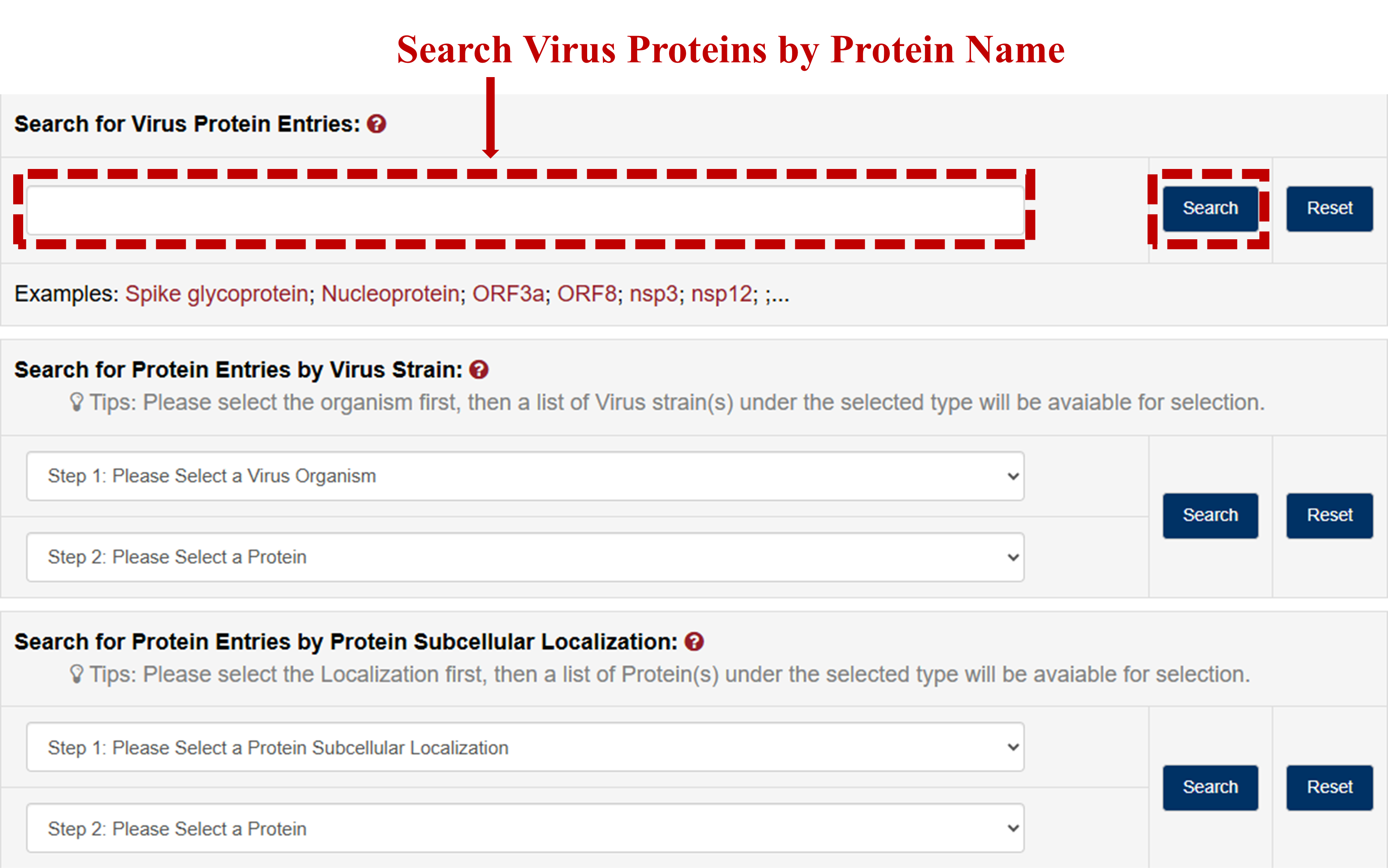 Virus protein related interactions can be searched by entering the protein name in the “search box” on the main page and in the “Search for virus protein entries” on the search page.