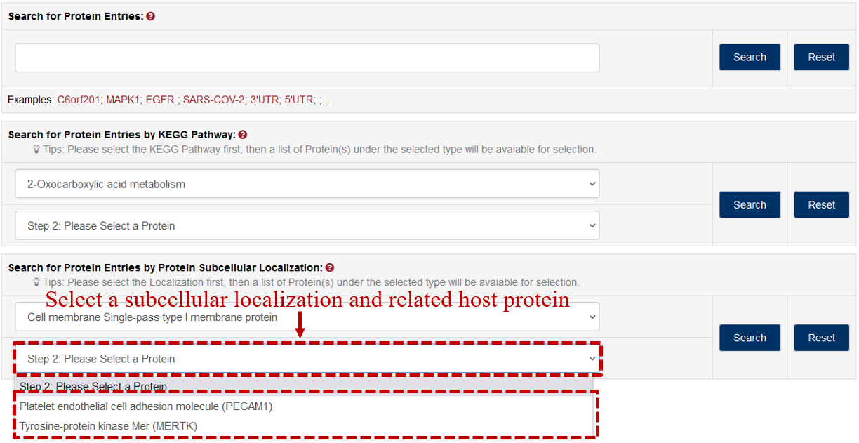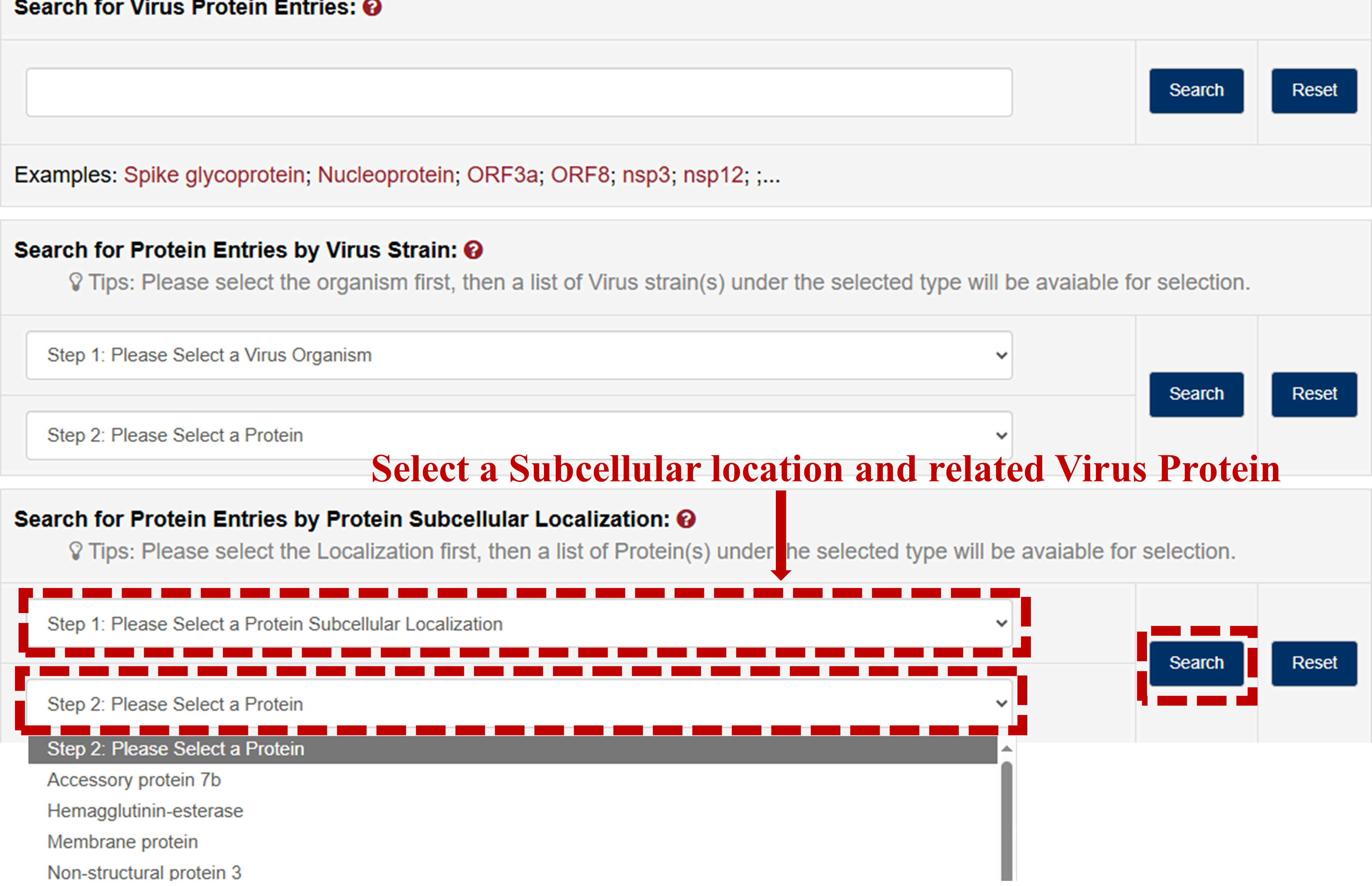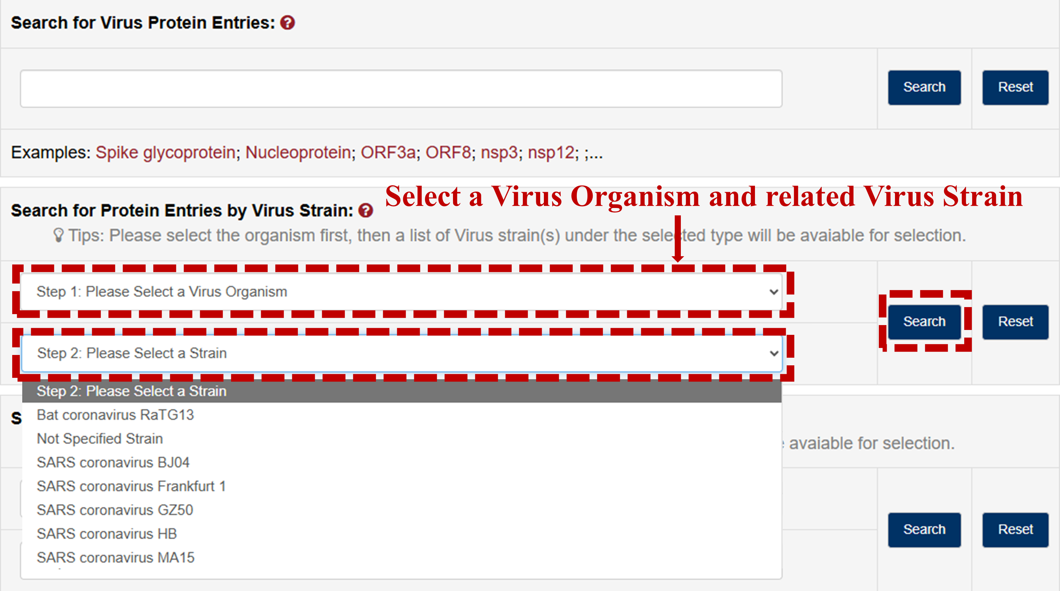 If users want to know detailed information on the interaction with any of strains the coronavirus proteins belong to, the user can search by selecting an organism and selecting a strain of this organism by “Search for virus protein entries” or “Search for protein entries by virus strain”.
