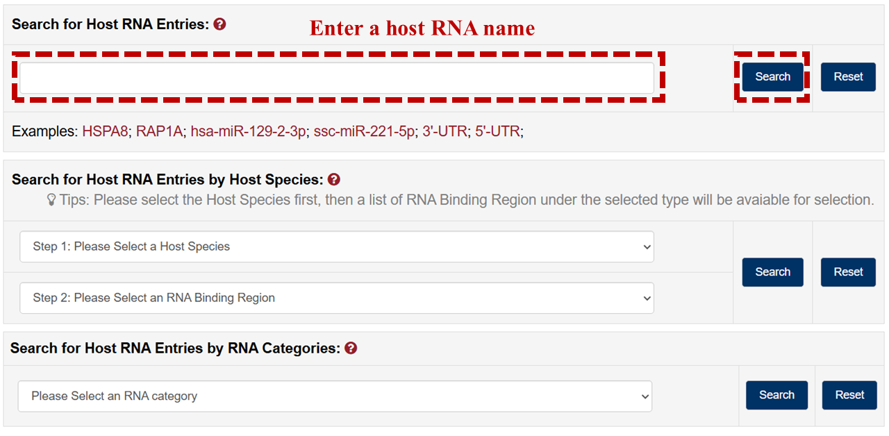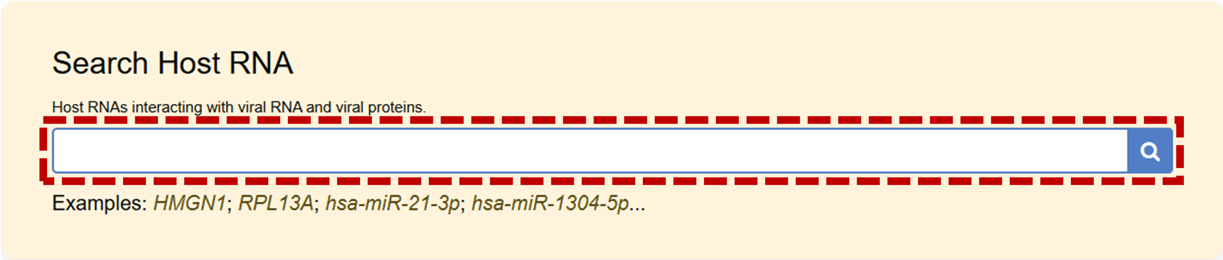 Host RNA related interactions can be searched by entering the RNA name in the “search box” on the main page and in the “Search for host RNA entries” on the search page.