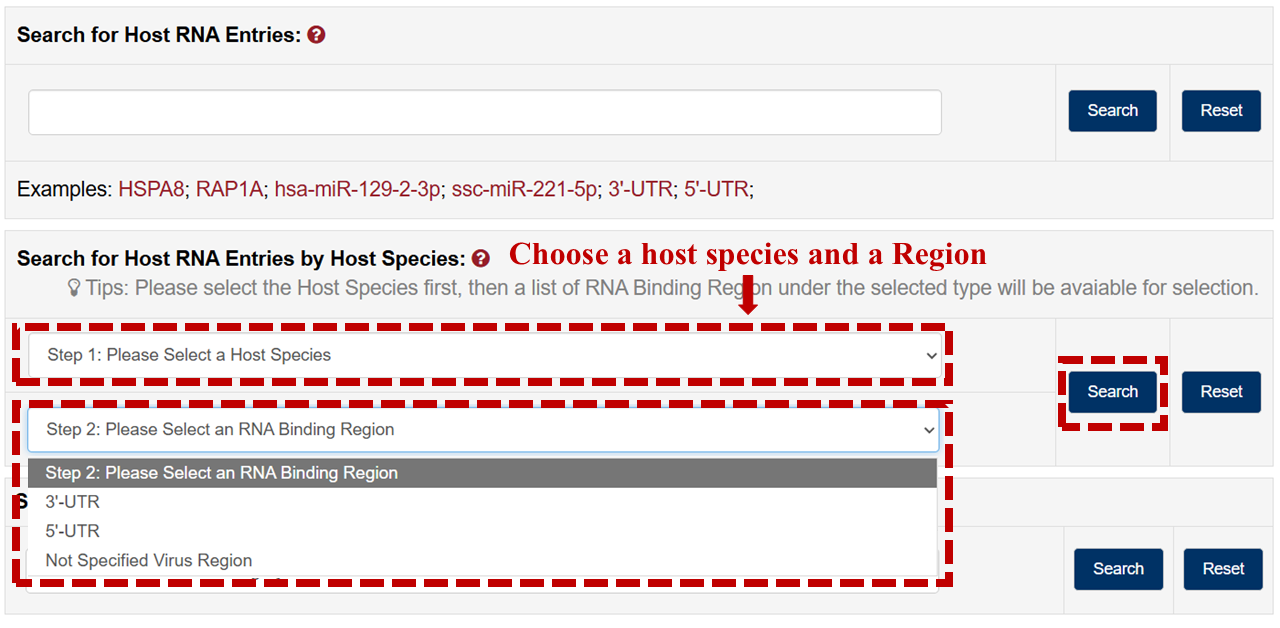 If users want to know detailed information on the interaction with any of host species the host RNA belongs to, the user can search by selecting a host species and selecting an RNA binding region of this speceis by “Search for host RNA entries” or “Search for host RNA entries by host species”.