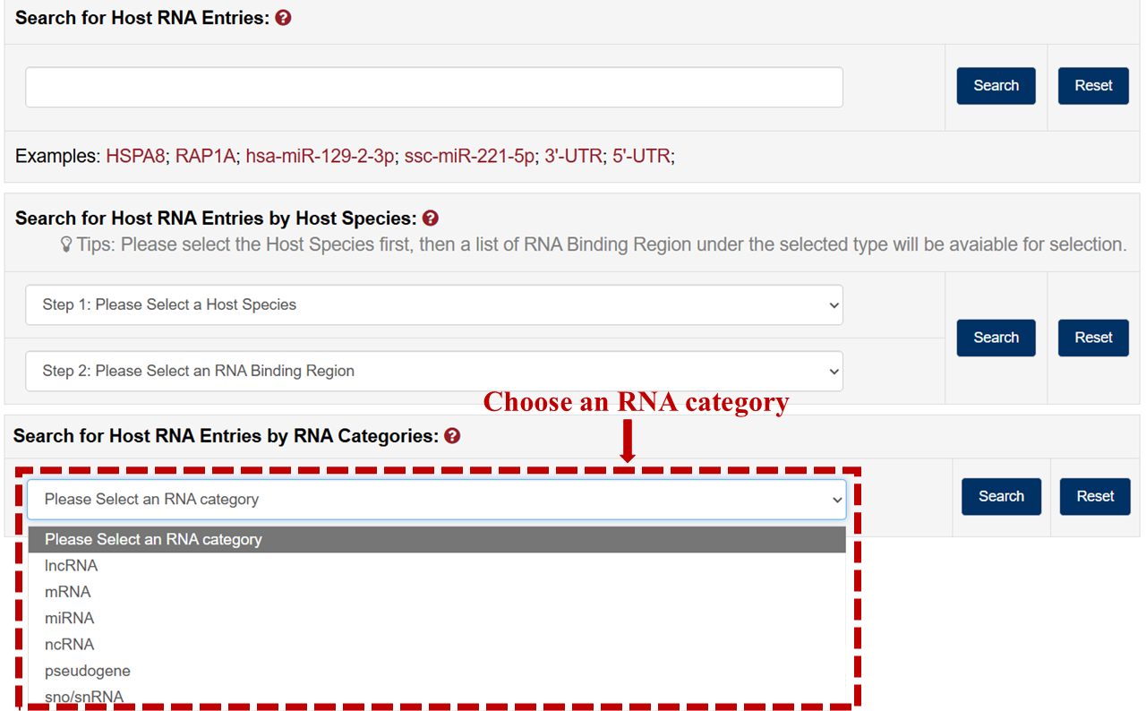 Host RNA related interactions can be searched by selecting the category of RNA in the “search box” on the main page and in the “Search for host RNA entries by RNA categories” on the search page.