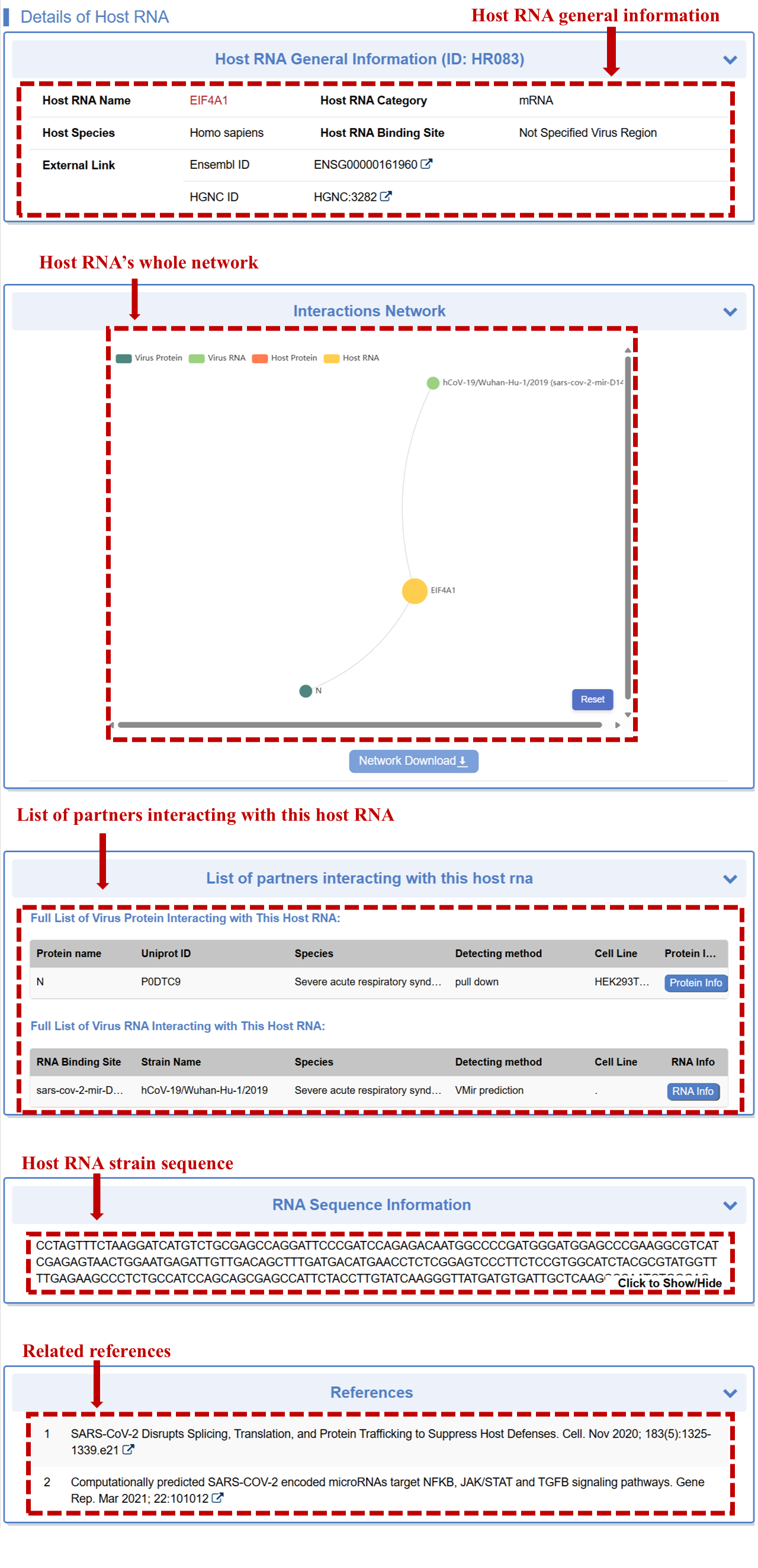 The host RNA page contains mainly “host RNA General information”, “Interactions Network”, “List of partners interacting with this host RNA”, “RNA Sequence Information” and “References” information.