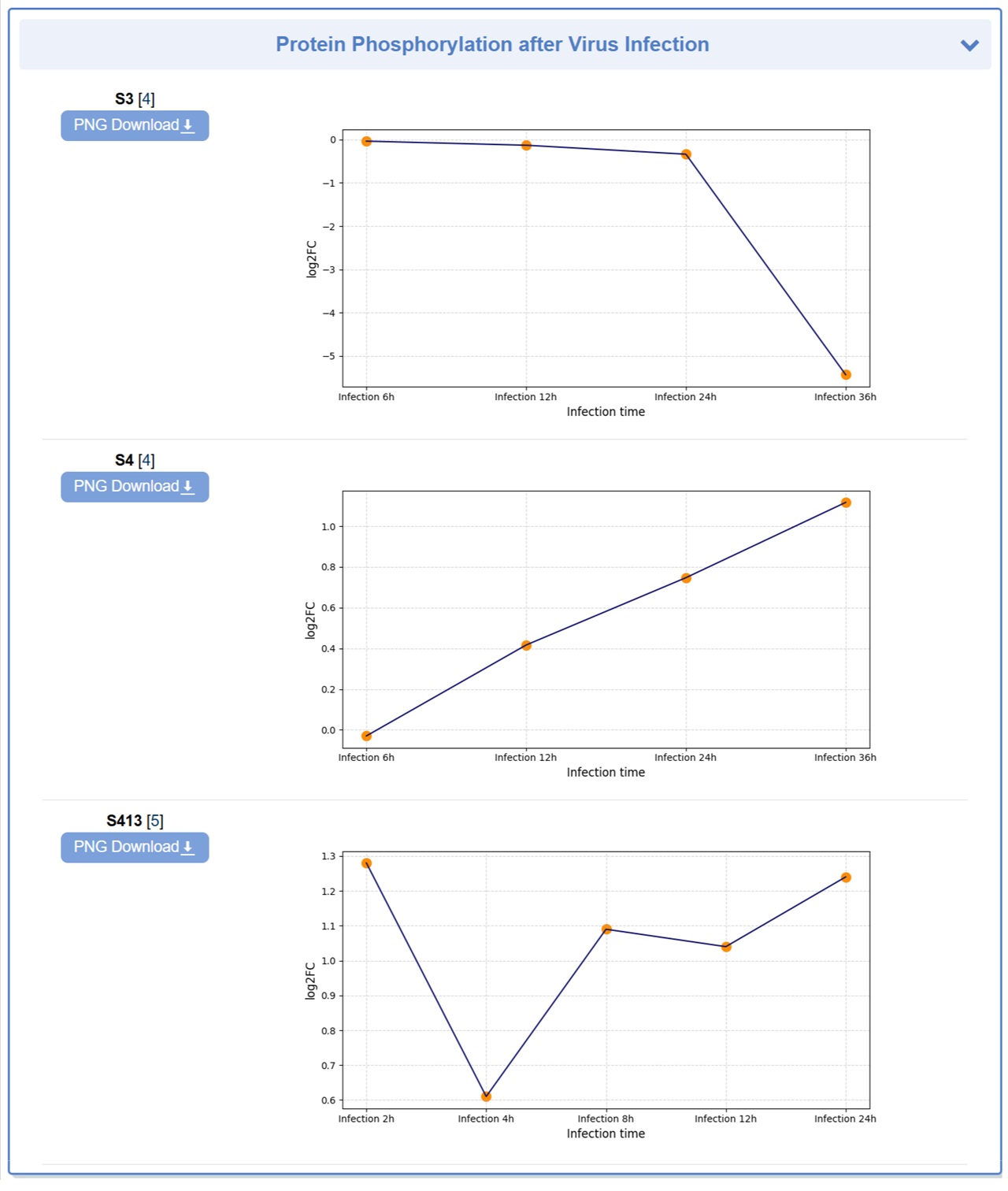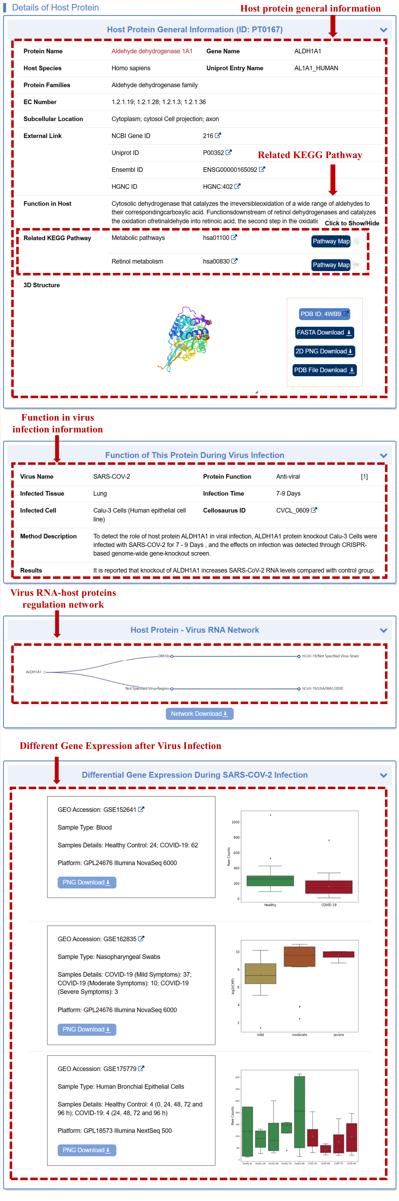 By clicking the “Pro info” button, the detailed information page of this protein detailed information will be displayed. Details of Host Protein page contain mainly “Host protein general information”, Related “KEGG pathways” information, “Protein function during virus infection”, and “Virus RNA-host proteins regulation networks” information. The details page includes: “Host Protein General information”, “Protein Function in Virus Infection”, “Protein-Virus RNA Network”, “Different Gene Expression after Virus Infection”, “Protein Phosphorylation after Virus Infection”, “Potential Drugs Target Information of this Protein”,“Protein Sequence Information”, and “References”.